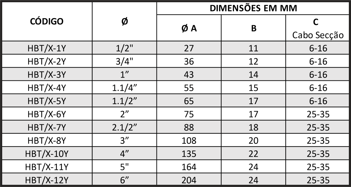 De 2" a 6": com terminal de aterramento para cabos de 25 a 35 mm2