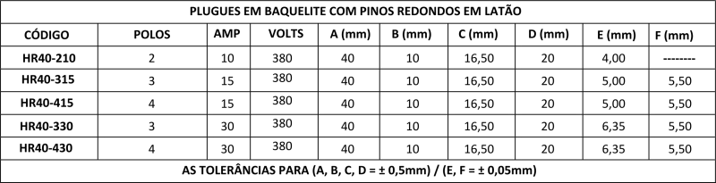 Corpo em baquelite na cor preta e contatos em latão cilíndrico, com pino terra de cor diferenciada.